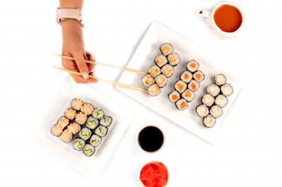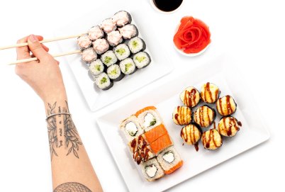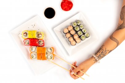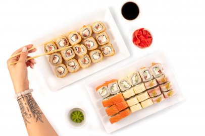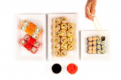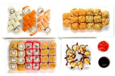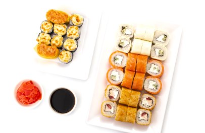 Васаби, имбирь, соевый соус 2шт, Филадельфия лайт, Дайкон ролл 1/2, Калифорния с крабом 1/2, Классика с огурцом, Классика с курицей и соусом (сверху),