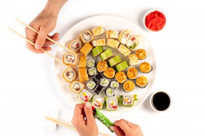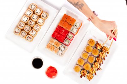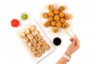 Васаби, имбирь, соевый соус 2шт, Темпура с курицей, Филадельфия с креветкой, Калифорния с крабом, Филадельфия лайт, Запеченный Фудзи, Запеченная креветка, Темпура снежный краб,