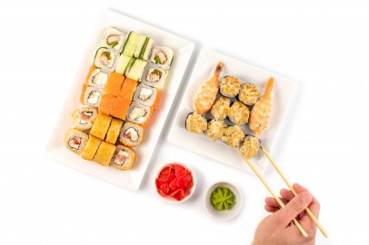 Васаби, имбирь, соевый соус 2шт, Классика с лососем, Классика с крабом, Классика с креветкой темпура, Классика с огурцом, Классика с курицей и соусом(сверху),