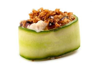 Рис, огурец, курица, майонез, лук криспи, соус терияки,