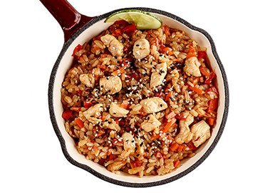 Курица, Кунжут, Морковь, Пекинская капуста, Перец болгарский , Рис, Чеснок , Соус Фирменный,