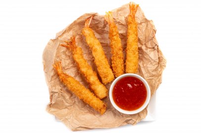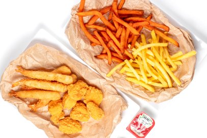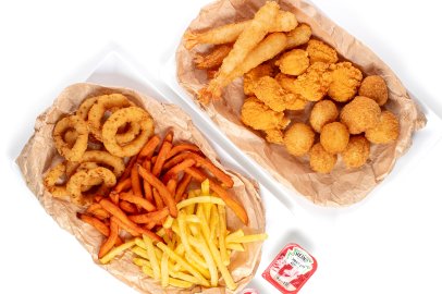 Картофель фри, Батат фри, Куриный попкорн, Креветки темпура, Томатный соус 2шт,